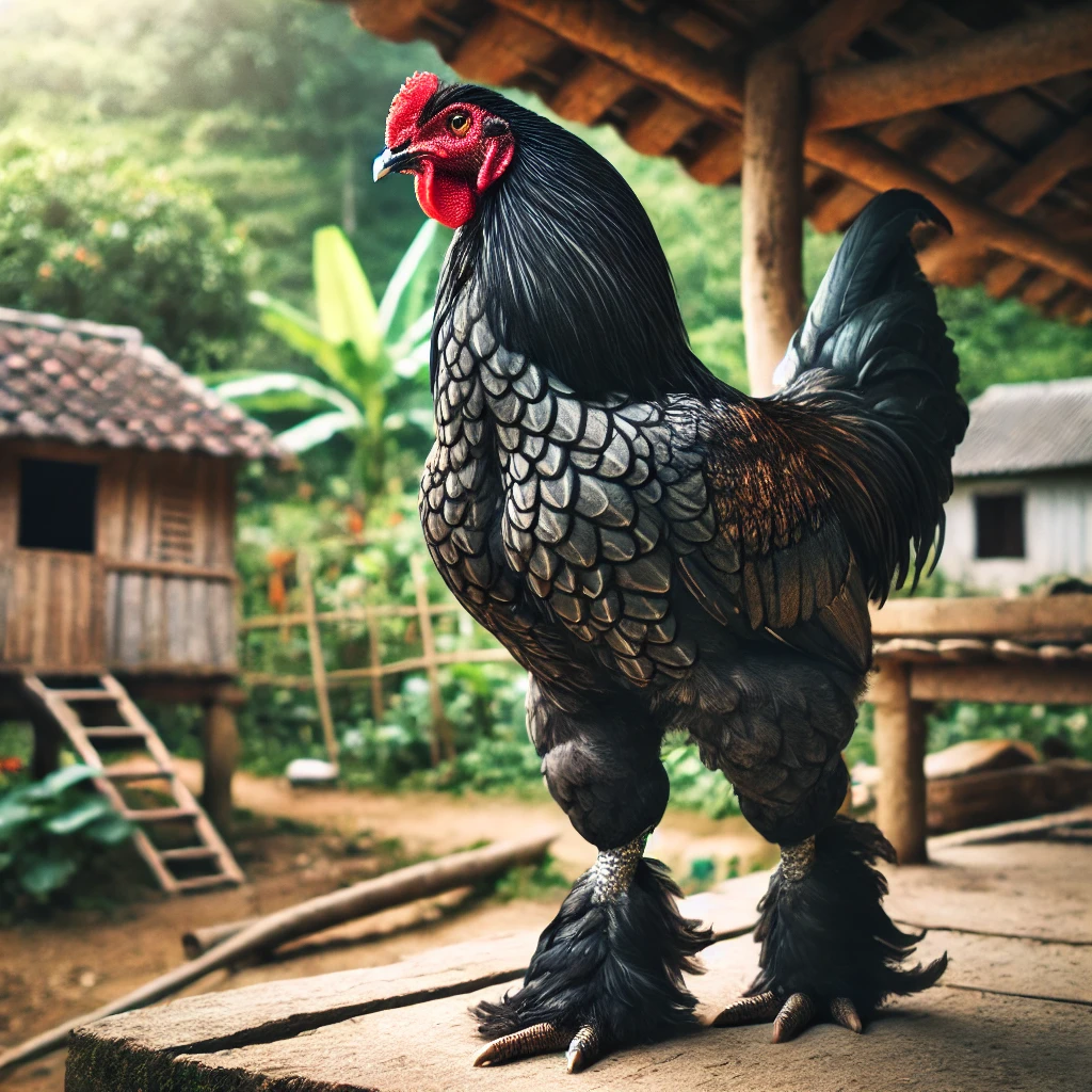 Physical Appearance: Dong Tao chickens are large, with males weighing up to 4 kg (8.8 lbs) and females weighing around 3 kg (6.6 lbs). They have a wide body with thick, sturdy legs that give them a powerful stance. Their legs are their most unique feature, often compared to the legs of a dragon. These chickens also have a red comb and wattles, with a glossy, dark-colored plumage.