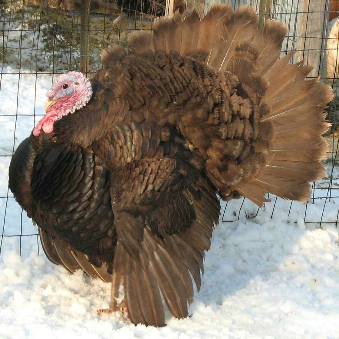 One of the larger variety of heritage breed turkeys, having all brown feathering.